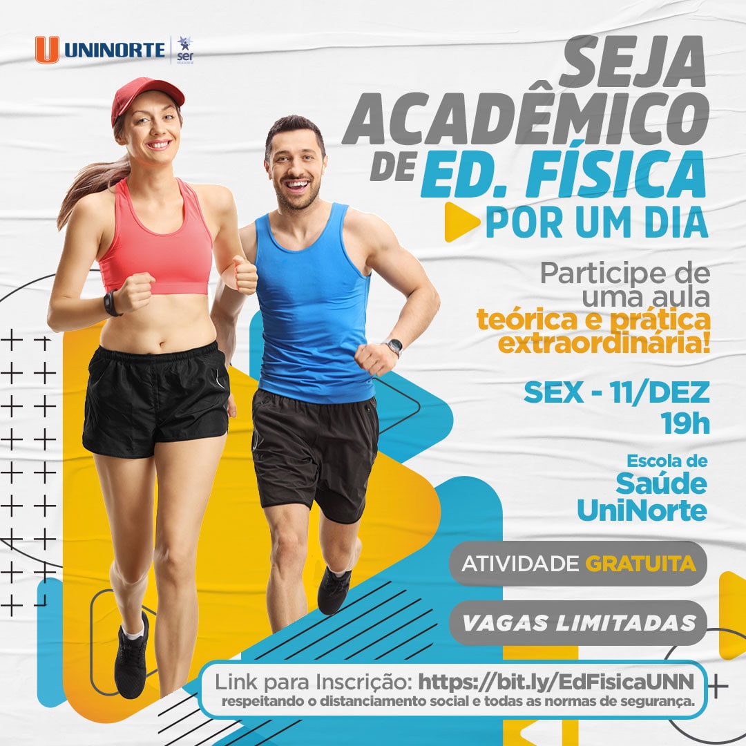 Escolher o curso e a instituição de ensino onde se vai estudar é uma decisão importante para o futuro profissional de alguém. Nesse processo, o pré-universitário deve avaliar critérios como grade curricular, corpo docente e infraestrutura das instituições antes de fazer sua escolha . Foi pensando nisso que o curso de Educação Física da UniNorte – Centro Universitário do Norte promove o evento “Acadêmico por 1 dia”, onde os interessados poderão experimentar como é estudar na instituição.