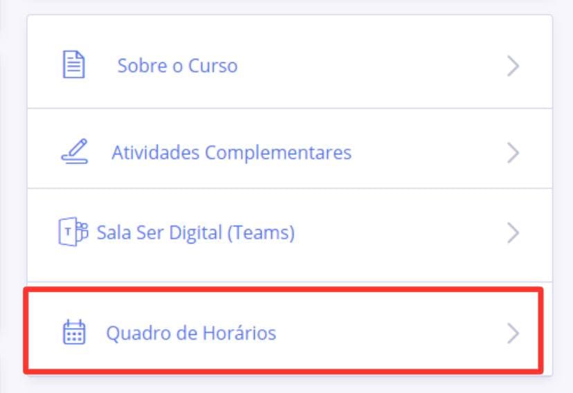 Calouro e veterano, para acompanhar o seu horário de aula e saber se será necessário que você venha até a instituição para as aulas presenciais, consulte o seu PORTAL DO ALUNO no menu QUADRO DE HORÁRIOS, como na imagem abaixo: