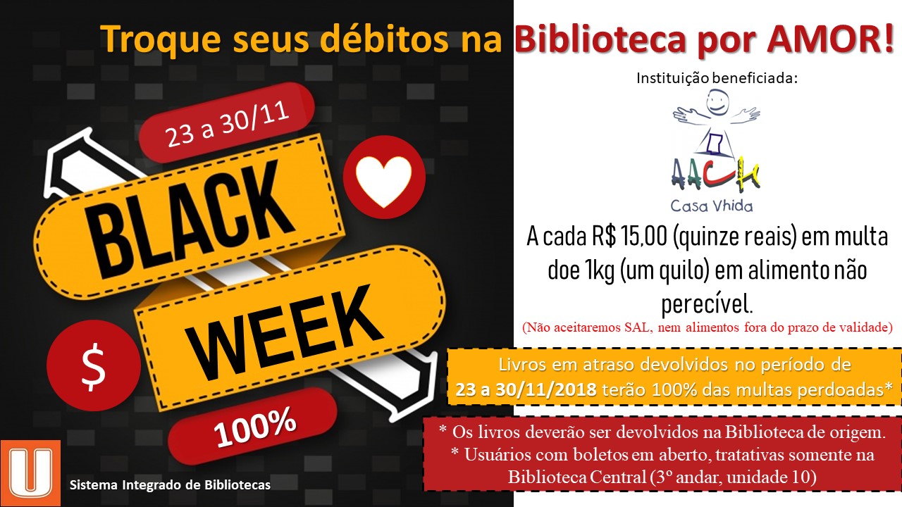 Você está sabendo da BLACK WEEK Biblioteca Solidária 2018? No período de 23 a 30 de novembro a Biblioteca da UniNorte está dando perdão de 100% nas multas para débitos com livros, através de doação de alimentos não perecíveis (exceto sal).