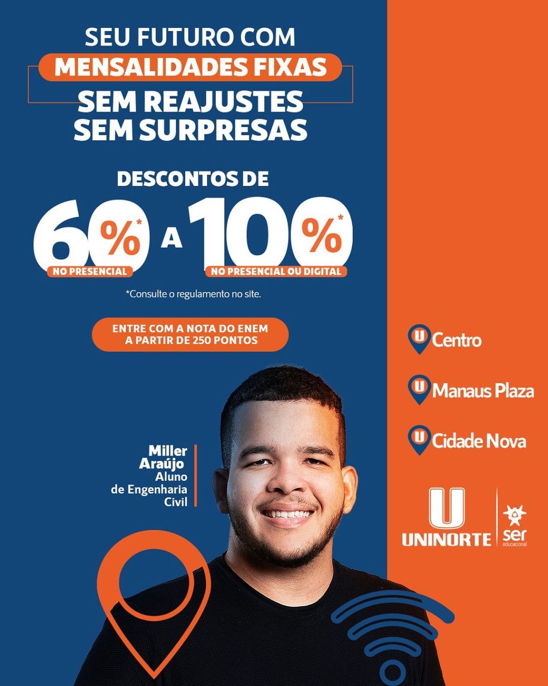 Quem ingressar na UNINORTE via nota do Enem terá ainda direito a mensalidades com valores fixos, sem reajuste anual. Ou seja, o preço será o mesmo até o final do curso. Além disso, o aluno também terá matrícula, 2ª e 3ª mensalidades no valor promocional de R$49.