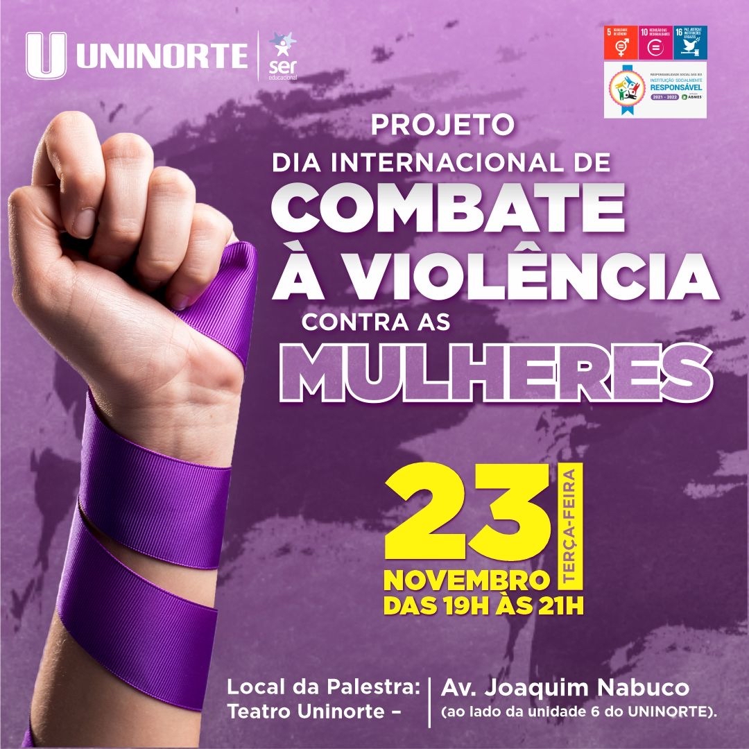 No dia 23 de novembro, a partir das 19h, o UNINORTE – Centro Universitário do Norte promove uma palestra sobre a rede de enfrentamento à violência contra a mulher no Amazonas. O evento será presencial, no Teatro da Unidade 6, situado na Avenida Joaquim Nabuco, 1365, Centro. A participação é gratuita.