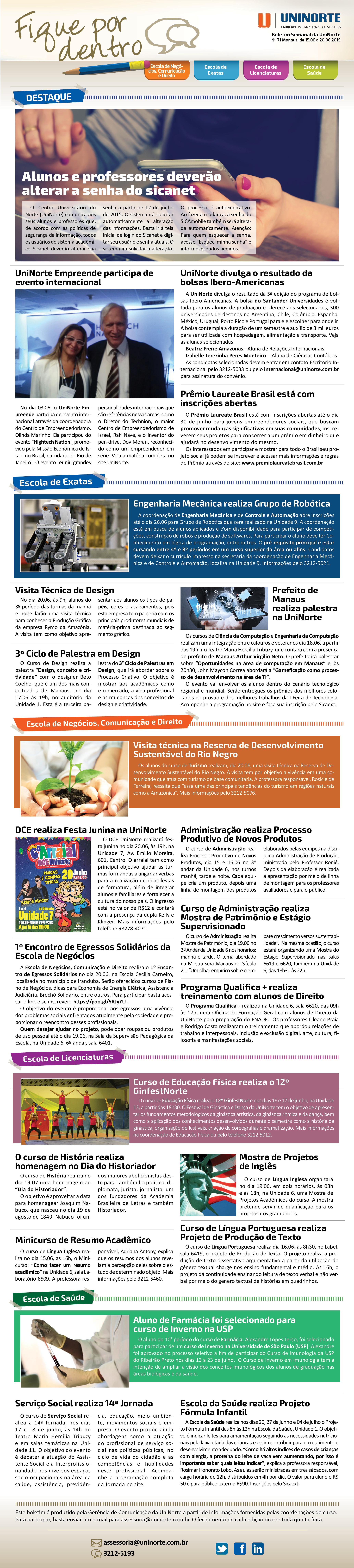 Segunda-feira, 15 de Junho de 2015 às 11h29Acompanhe na Edição 71 do Boletim Fique por Dentro, o resumo dos eventos dessa semana:
