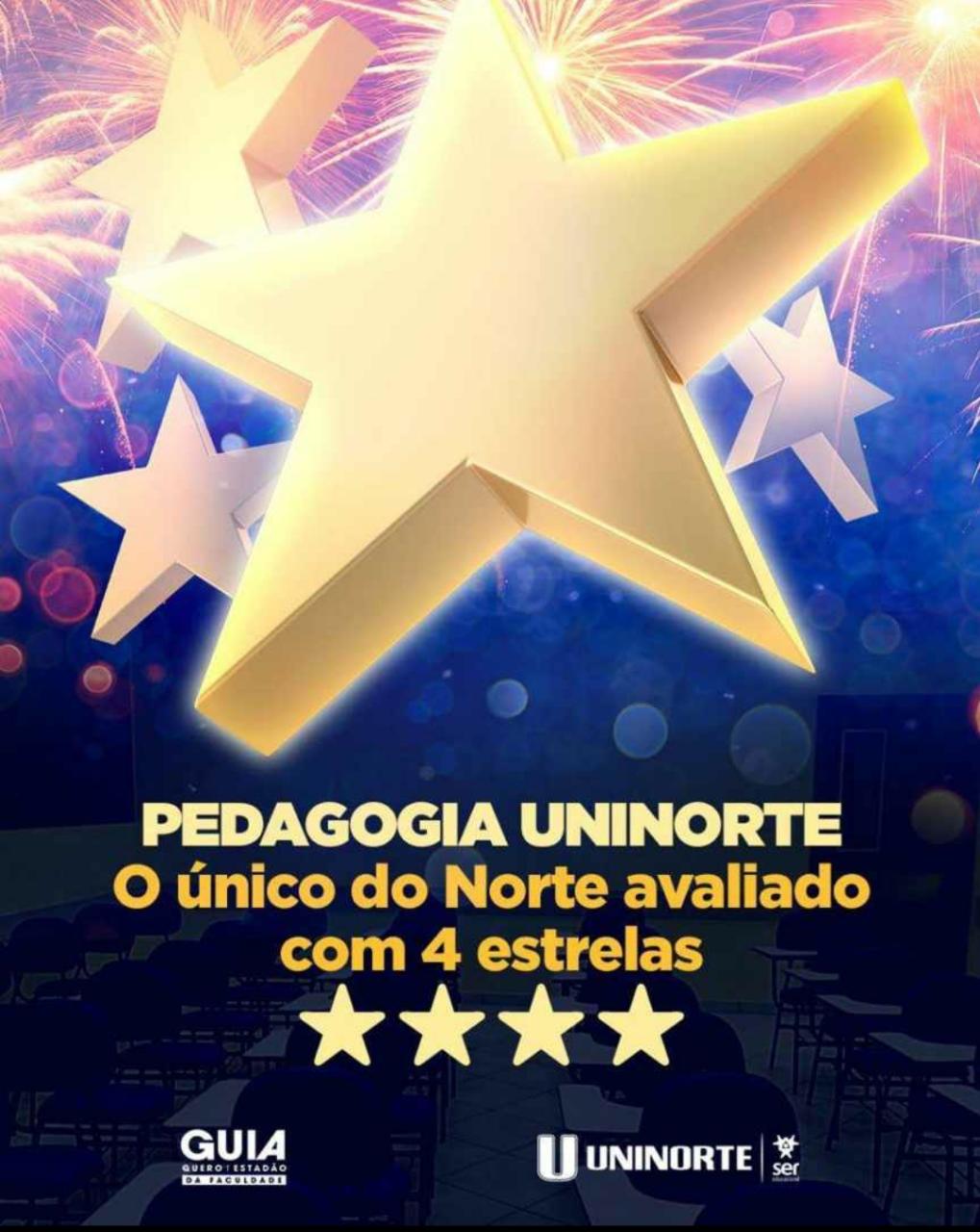 A graduação em Pedagogia da UniNorte – Centro Universitário do Norte conquistou quatro estrelas no Guia da Faculdade Estadão, certificando-se como o curso mais bem avaliado entre as faculdades particulares do Amazonas. A publicação avalia anualmente a qualidade dos cursos de ensino superior do Brasil. O curso de Pedagogia da UniNorte também ficou entre os cinco melhores do Guia, considerando instituições públicas e privadas.