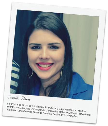 Camila Daou é egressa do curso de Administração Pública e Empresarial com MBA em Eventos de Luxo pela Universidade Corporativa Roberto Miranda –São Paulo.  Ela atua como Gerente Geral do Studio 5 Centro de Convenções.