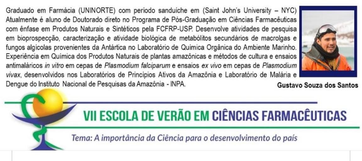O egresso do curso de Farmácia da UniNorte Gustavo Souza dos Santos, que atualmente é aluno de Doutorado no Programa de Pós-Graduação em Ciências Farmacêuticas com ênfase em Produtos Naturais e Sintéticos pela FCFRP – USP, será um dos palestrantes da 7ª Escola de Verão em Ciências Farmacêuticas, o tema da escola esse ano será “A importância da Ciência para o desenvolvimento do país”.