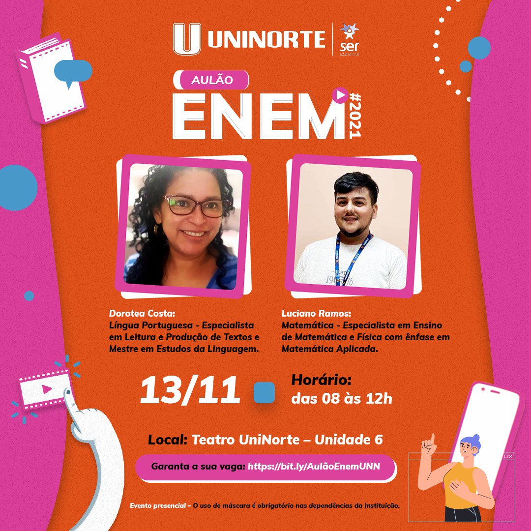Os professores que vão ministrar o Aulão Enem são a mestra em Estudos da Linguagem, especialista em Leitura e Produção de Textos e docente da UniNorte, Dorotea Costa; e o especialista em Ensino da Matemática e Física com ênfase em Matemática Aplicada e docente da UniNorte, Luciano Ramos.