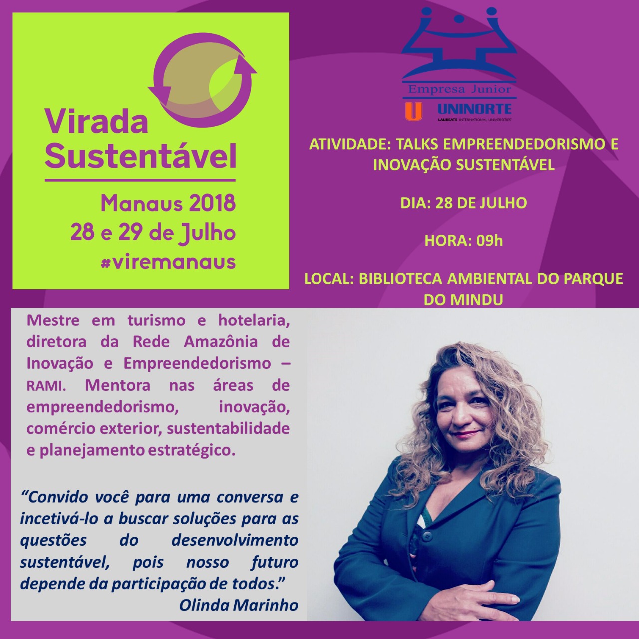 Olinda Marinho que é Mestre em comércio exterior, turismo e Hotelaria e Planejamento Estratégico atualmente Coordenadora da Empresa Junior da UniNorte, onde gerencia e coordena projetos focados em empreendedorismo, inovação, sustentabilidade, comércio exterior e turismo, é professora, tutora e mentora, também participará como palestrando no evento.