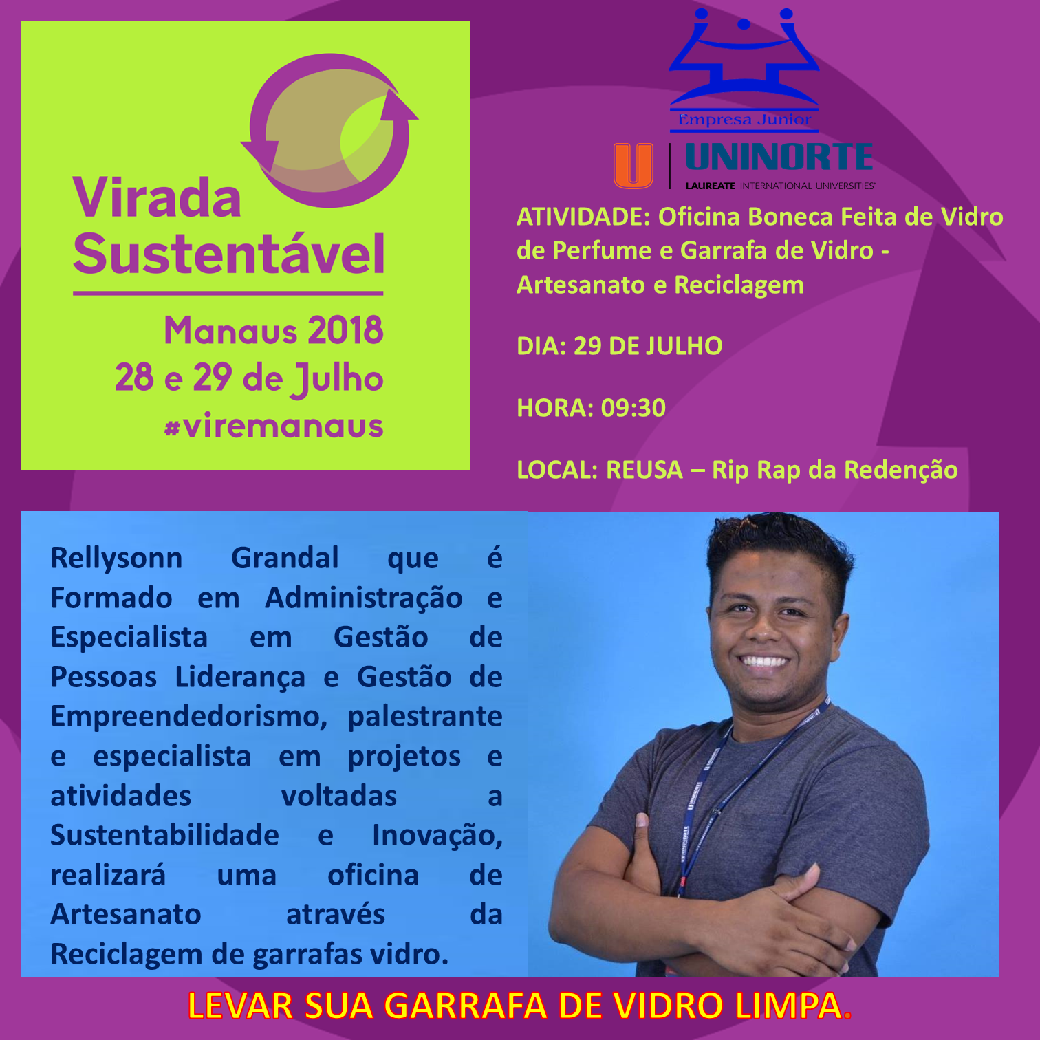 A Virada Sustentável Manaus acontece todos os anos desde 2015 e a cada edição atrai um público maior com o objetivo de melhorar a sociedade e o meio ambiente a partir de uma visão alegre e inspiradora da sustentabilidade. Este ano o evento será realizado nos dias 28 e 29 de julho, a Empresa Junior da UniNorte participa do evento desde o início e esse ano participará com oficinas e palestras.