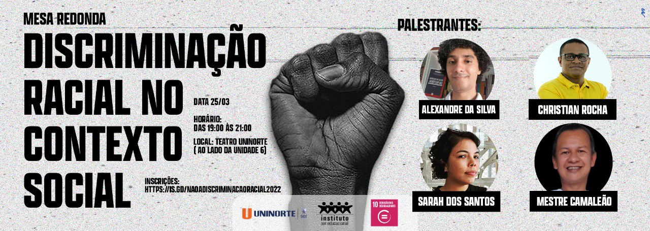 Na sexta-feira, dia 25, a partir das 19h, a UniNorte – Centro Universitário promove a Mesa Interdisciplinar Cultural – Discriminação Racial no Contexto Social. O evento tem o objetivo de falar sobre o racismo no ambiente escolar e na sociedade, assim como estratégias e ações para enfrentar esse tipo de preconceito. A atividade acontece de modo presencial, no auditório da Unidade 1, localizado na avenida Joaquim Nabuco, 1232, Centro.
