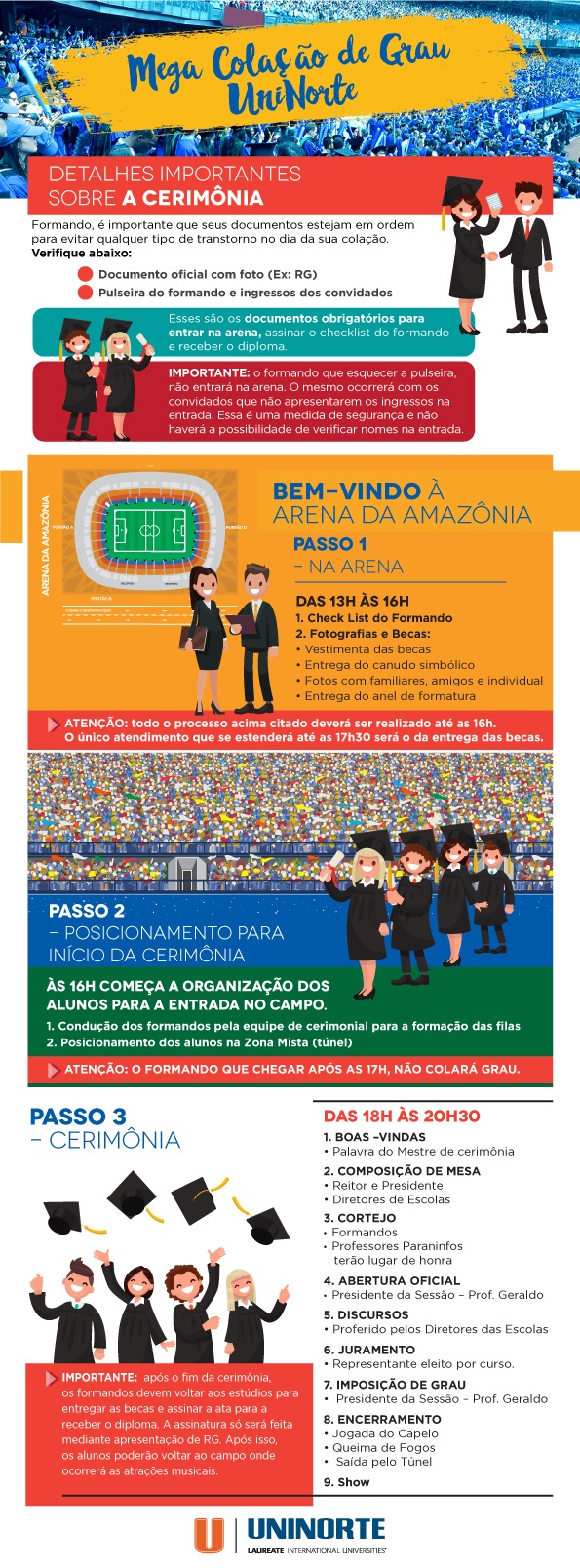 Quarta-feira, 15 de Março de 2017 às 18h06Formando, neste infográfico há informações importantes sobre cada momento de sua Colação de Grau no dia 17 de março, na Arena da Amazônia. Fique atento aos detalhes e programe-se. Preparamos também um FAQ com dúvidas frequentes para lhe ajudar. Basta clicar abaixo:
