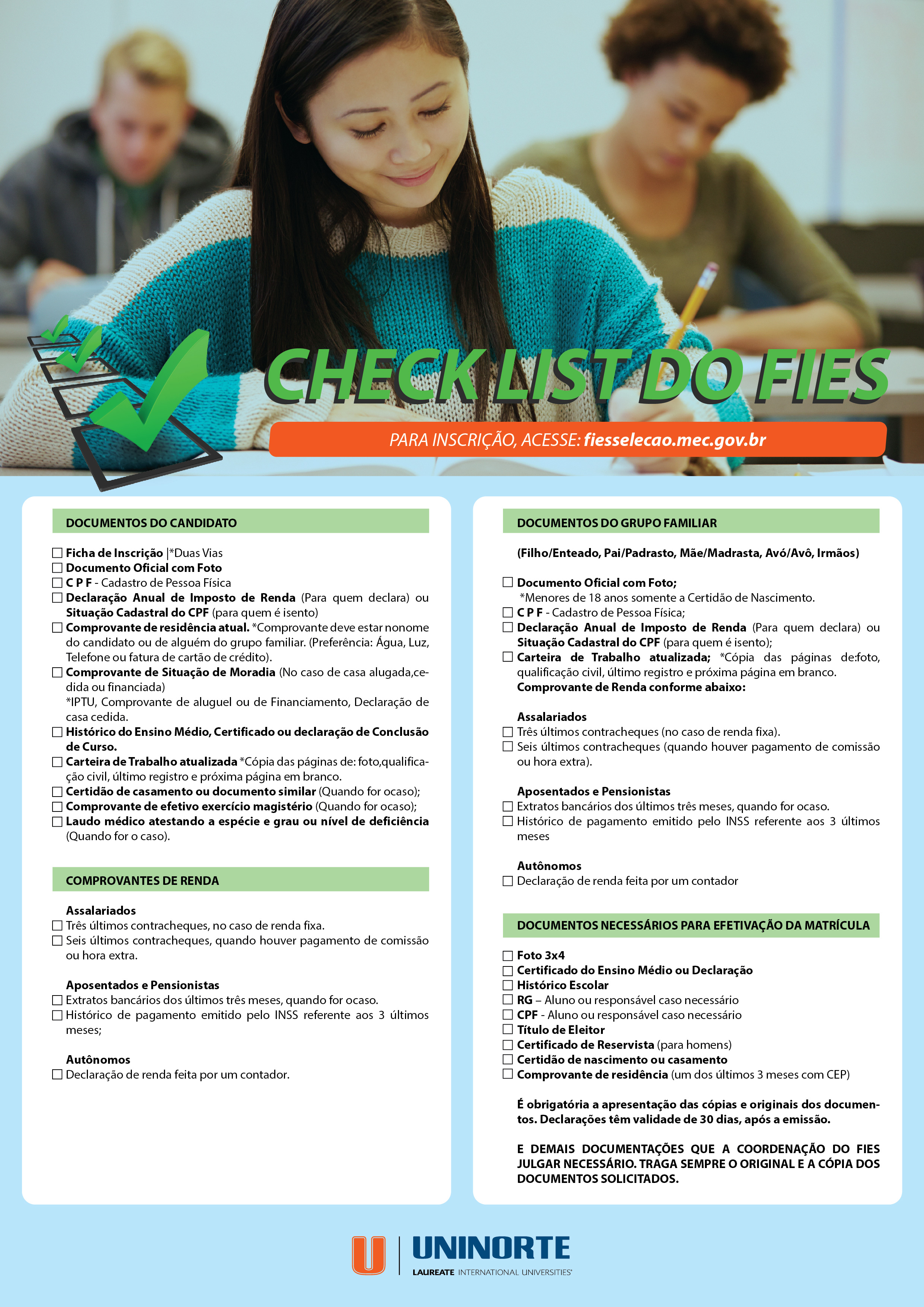 Se preferir, compareça ao Atendimento Fies que fica na Unidade 15 da UniNorte, localizada na Avenida Getúlio Vargas. Os atendentes vão te ajudar dando orientações sobre como finalizar sua inscrição no FIES. Finalize o processo trazendo a documentação necessária, você finaliza o processo de uma só vez.