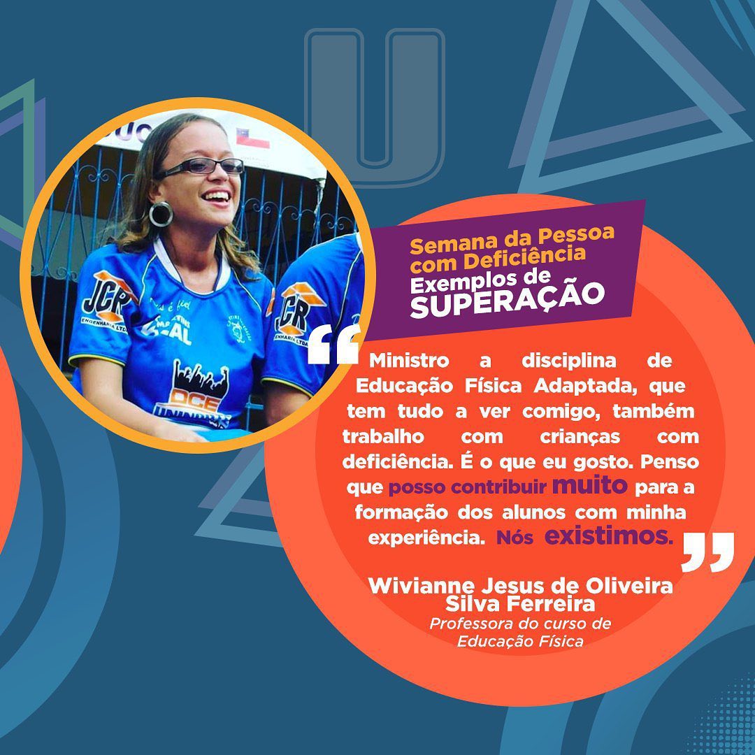 A grande paixão da professora do curso de Educação Física, Wiviane Ferreira, sempre foi ensinar. Por isso, mesmo após perder uma perna em decorrência de um câncer, ela não teve dúvida: recuperou-se e voltou para a sala de aula. Encarando uma nova vida como PcD, Wiviane decidiu combinar a nova condição com o trabalho e passou a ministrar a disciplina de Educação Física Adaptada.