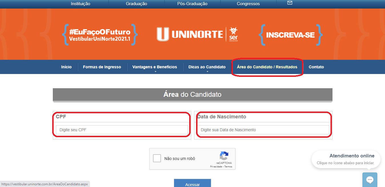 – Caso não saiba a sua matrícula, o aluno deve acessar https://vestibular.uninorte.com.br/login, o site dá acesso à área do candidato. Nesta área, o aluno preencherá os campos solicitados para ter o número da sua matrícula;