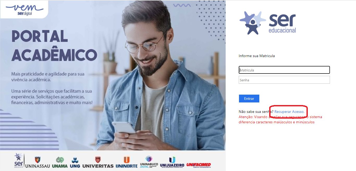 – Na tela seguinte o aluno deve clicar em Recuperar Acesso;