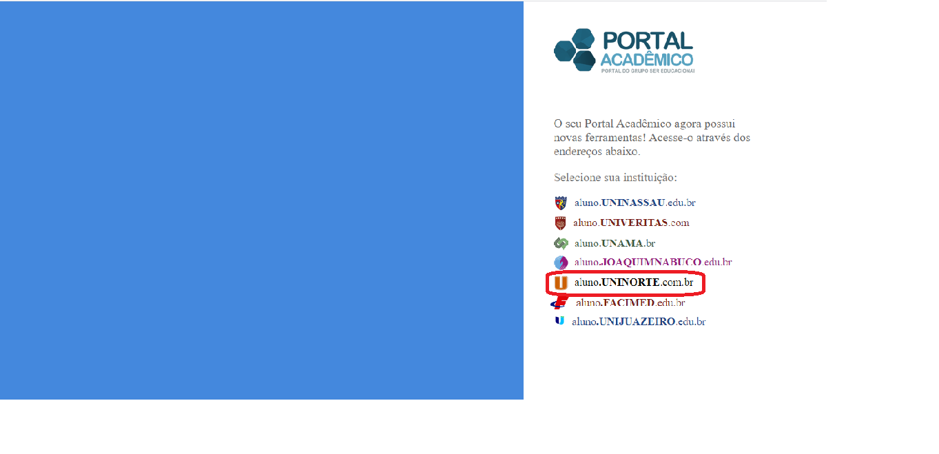 – Após envio de código, o aluno deve voltar ao portal pelo site https://aluno.sereduc.com/ escolher a UniNorte na tela;