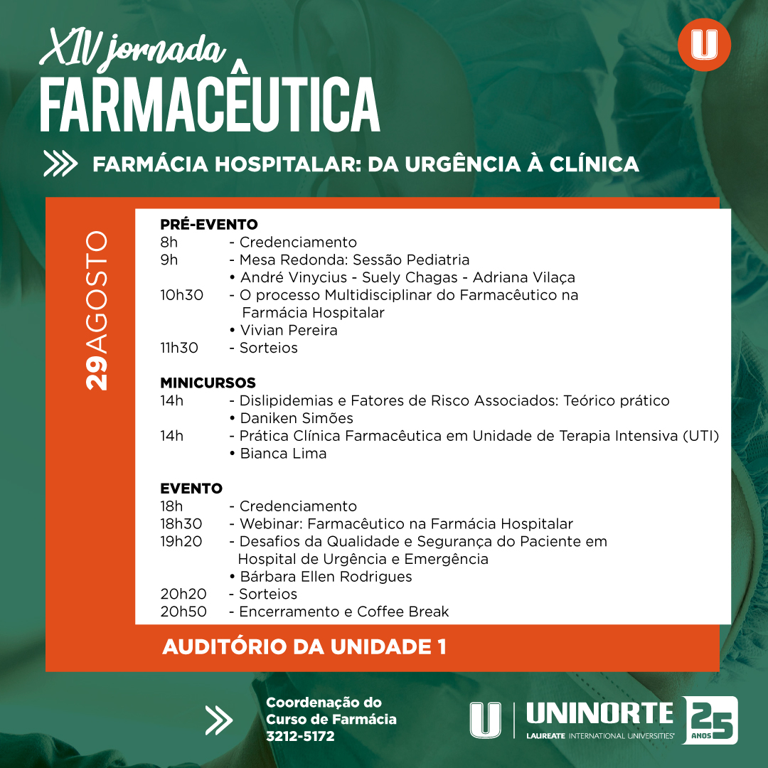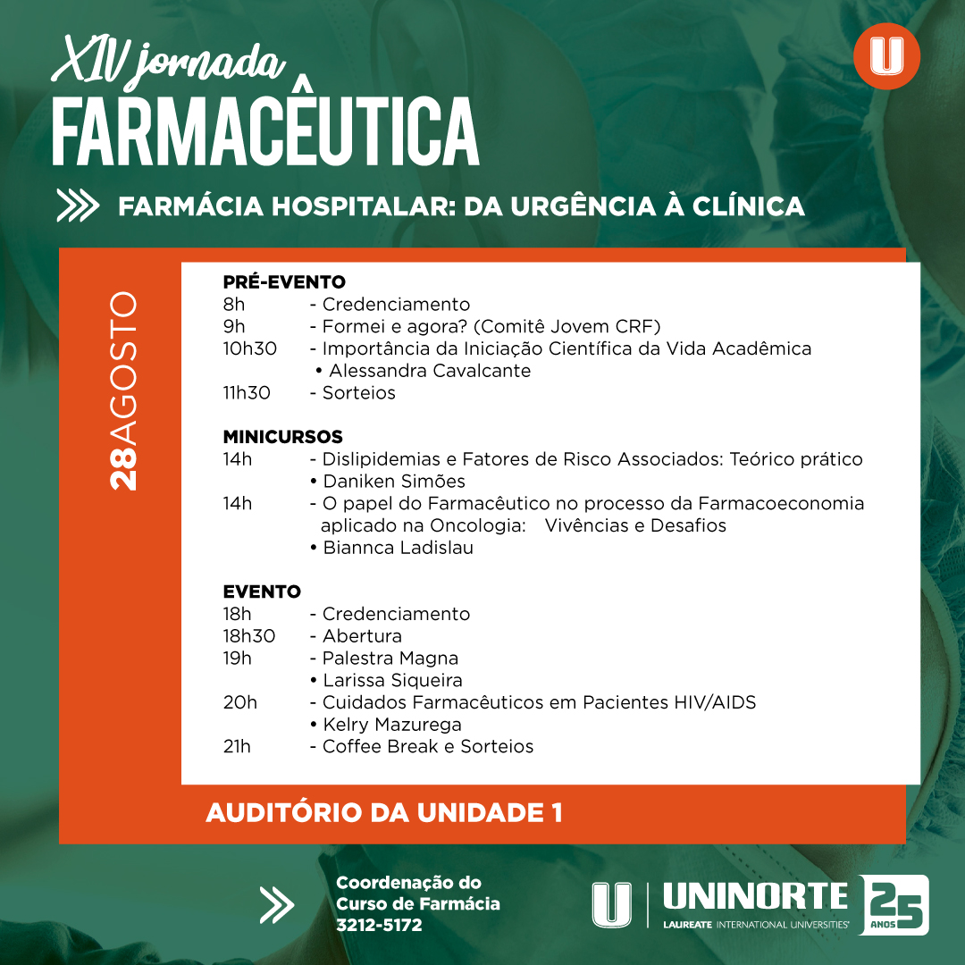 A coordenação do curso de Farmácia da UniNorte promove a XIV JORFAR – Jornada Farmacêutica, com o tema “Farmácia Hospitalar: da Urgência à Clínica”, nos dias 28 e 29 de agosto, das 8h às 21h, no Auditório e nos laboratórios multidisciplinares da Unidade 1.