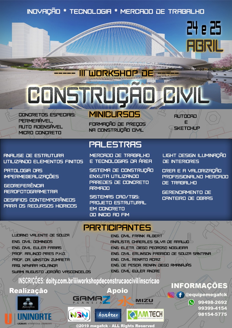 Os temas são atuais e englobam tudo o que se relaciona a Construção Civil. As inscrições custam de R$ 35 a 40,00 e podem ser realizadas neste link: https://doity.com.br/iiiworkshopdeconstrucaocivil/