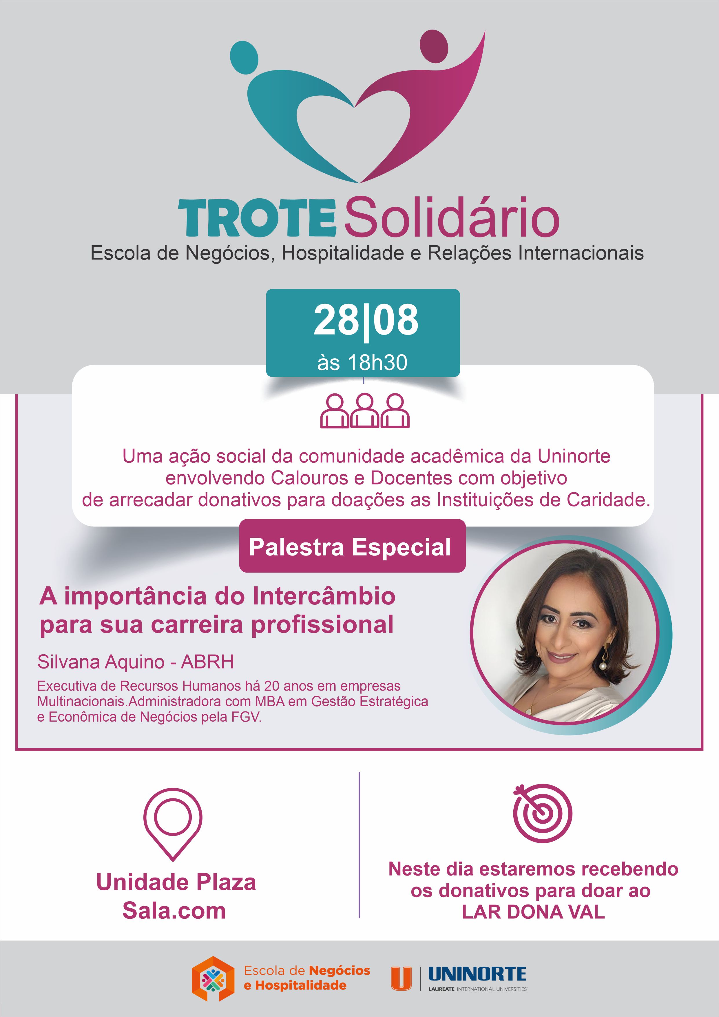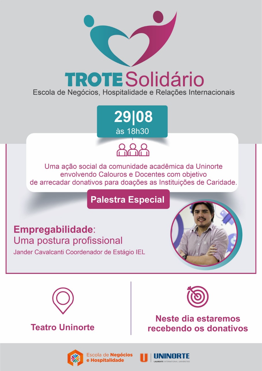 Quinta-feira, 22 de Agosto de 2019 às 17h36As ações do Trote Solidário estão acontecendo e agora está chegando a vez da Escola de Negócios, Hospitalidade e Relações Internacionais.