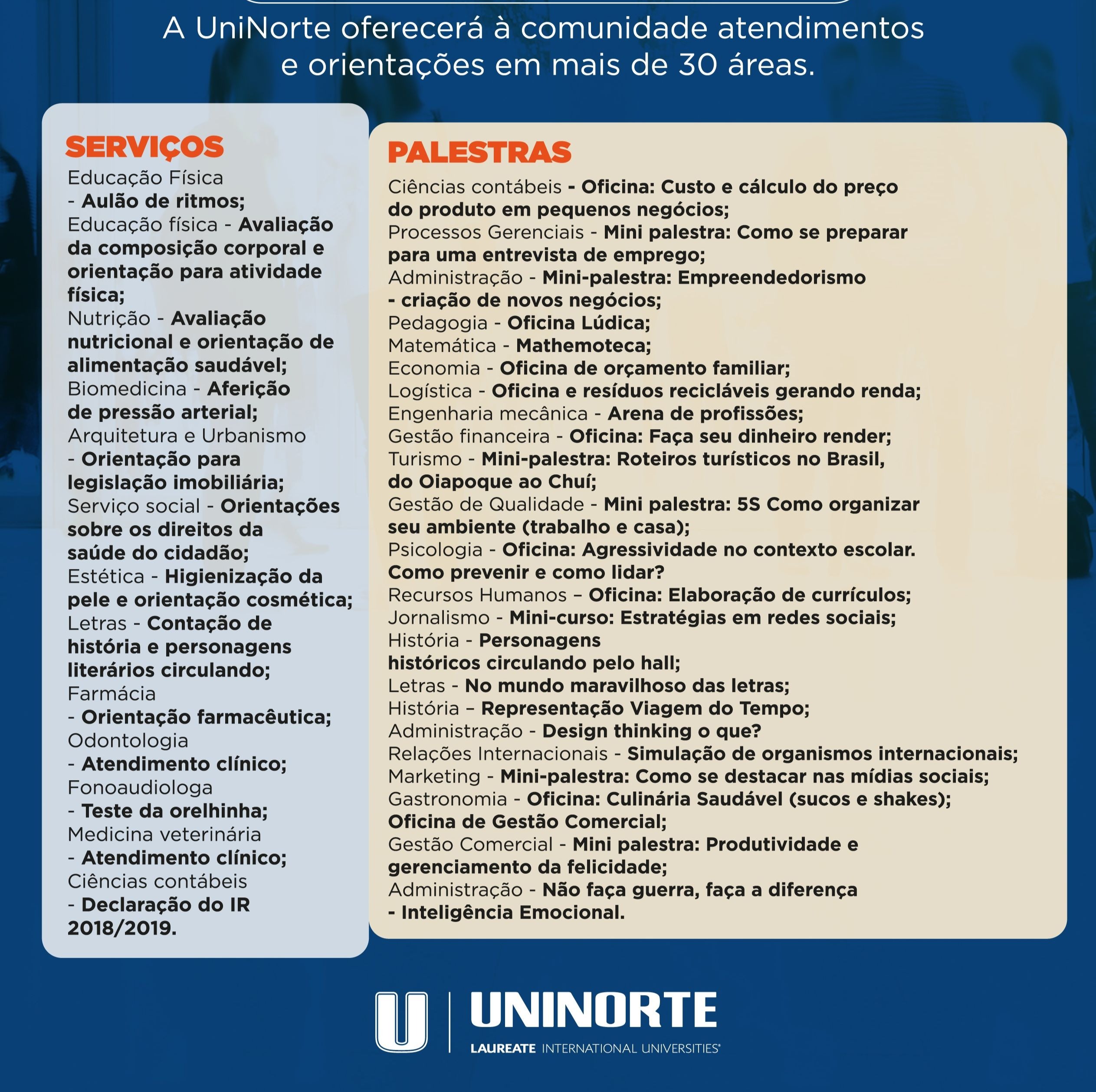 Além das dicas do UniNorte Prepara nesse dia você ainda poderá participar do evento “Faculdade de Portas Abertas” e realizar os seguintes serviços: