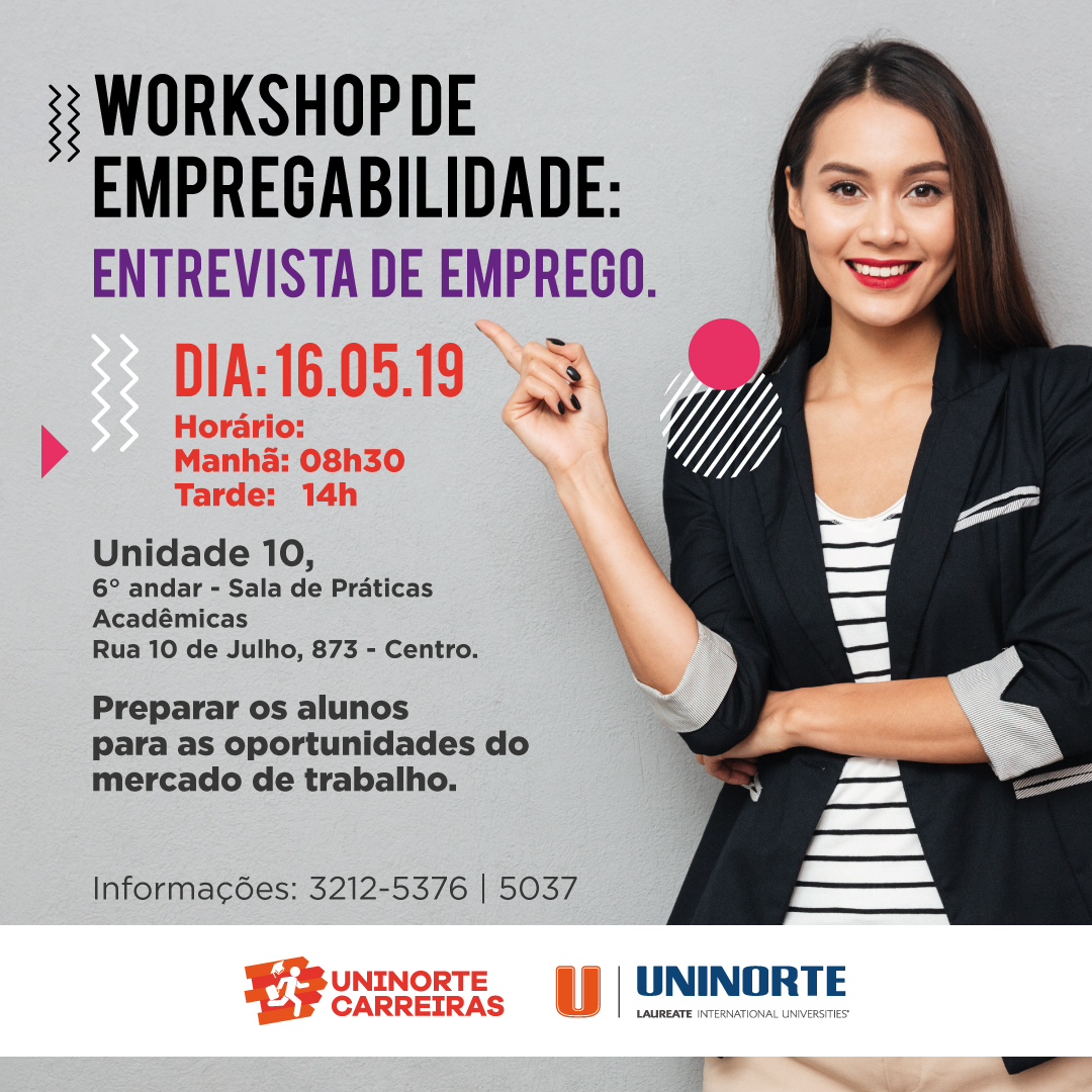 A UniNorte, por meio do Setor Carreiras realiza mais um Workshop de Empregabilidade, dessa vez o tema será “Entrevista de Emprego”, o evento acontecerá dia 16.05, em dois horários, às 8h30 e às 14h, na unidade 10 (Rua 10 de Julho, 873, Centro) 6º andar, Laboratório de práticas acadêmicas.
