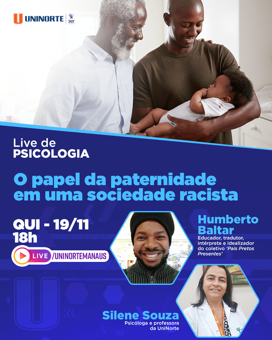 O curso de Psicologia da UniNorte – Centro Universitário do Norte realiza, nesta quinta-feira (19), uma palestra on-line com o tema “O papel da paternidade numa sociedade racista”. A live terá transmissão ao vivo e aberta ao público pelo perfil oficial da Instituição no Instagram, a partir das 18h. Para se inscrever, basta preencher o formulário eletrônico.