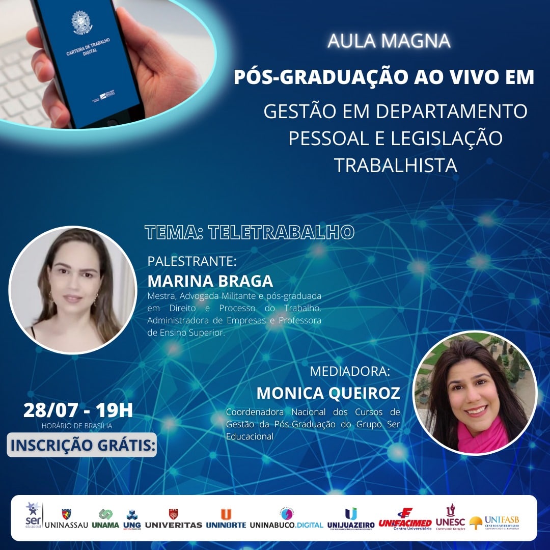 O tema da aula será teletrabalho. O evento terá como palestrante a advogada e pós-graduada em Direito e Processo do trabalho, Marina Braga. A mediadora será a coordenadora nacional dos cursos de Gestão da Pós-Graduação do grupo Ser Educacional, Monica Queiroz.