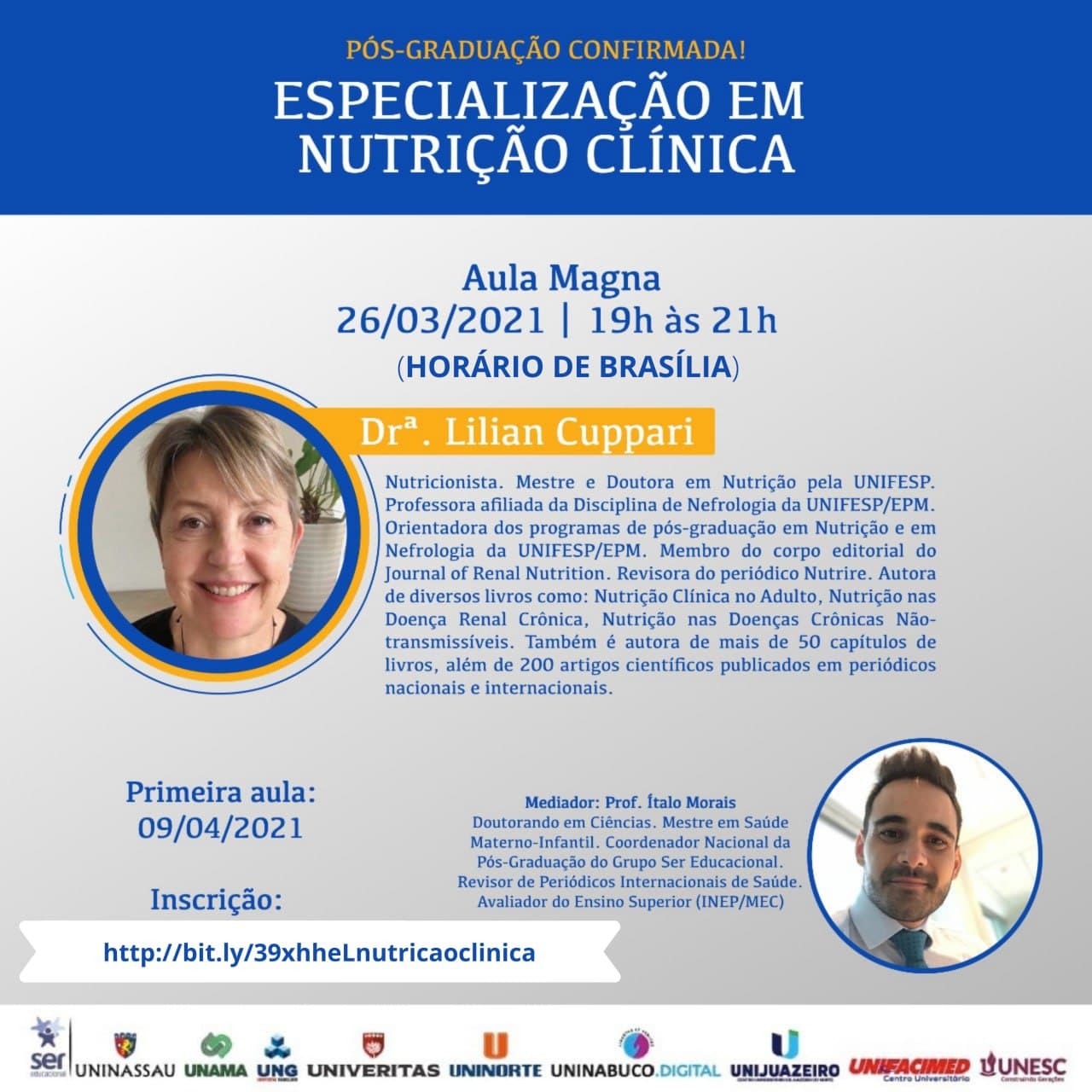 A aula contará com a participação da Docente do Curso, Dra. Lilian Cuppari, Nutricionista, Mestre e Doutora, autora de diversos livros, mais de 50 capítulos e 200 artigos publicados.