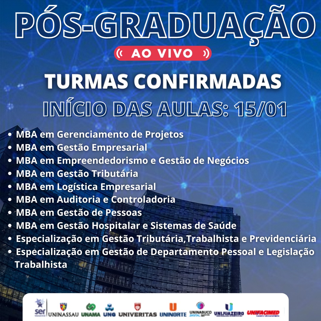As aulas da Pós-Graduação Ao Vivo iniciam em 15 de janeiro, veja a lista das turmas abaixo: