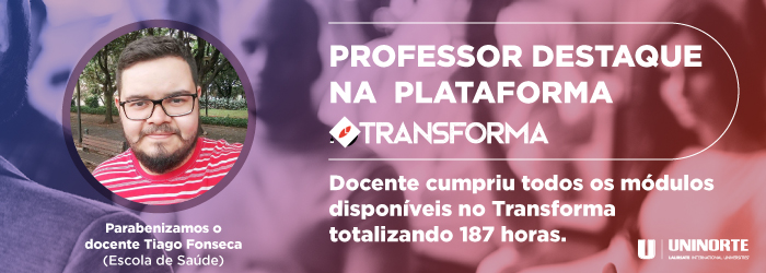O professor Tiago Fonseca, que leciona na escola de Saúde, foi o destaque da Plataforma Transforma, ele cumpriu todos os módulos disponíveis na plataforma contabilizando 187 horas.