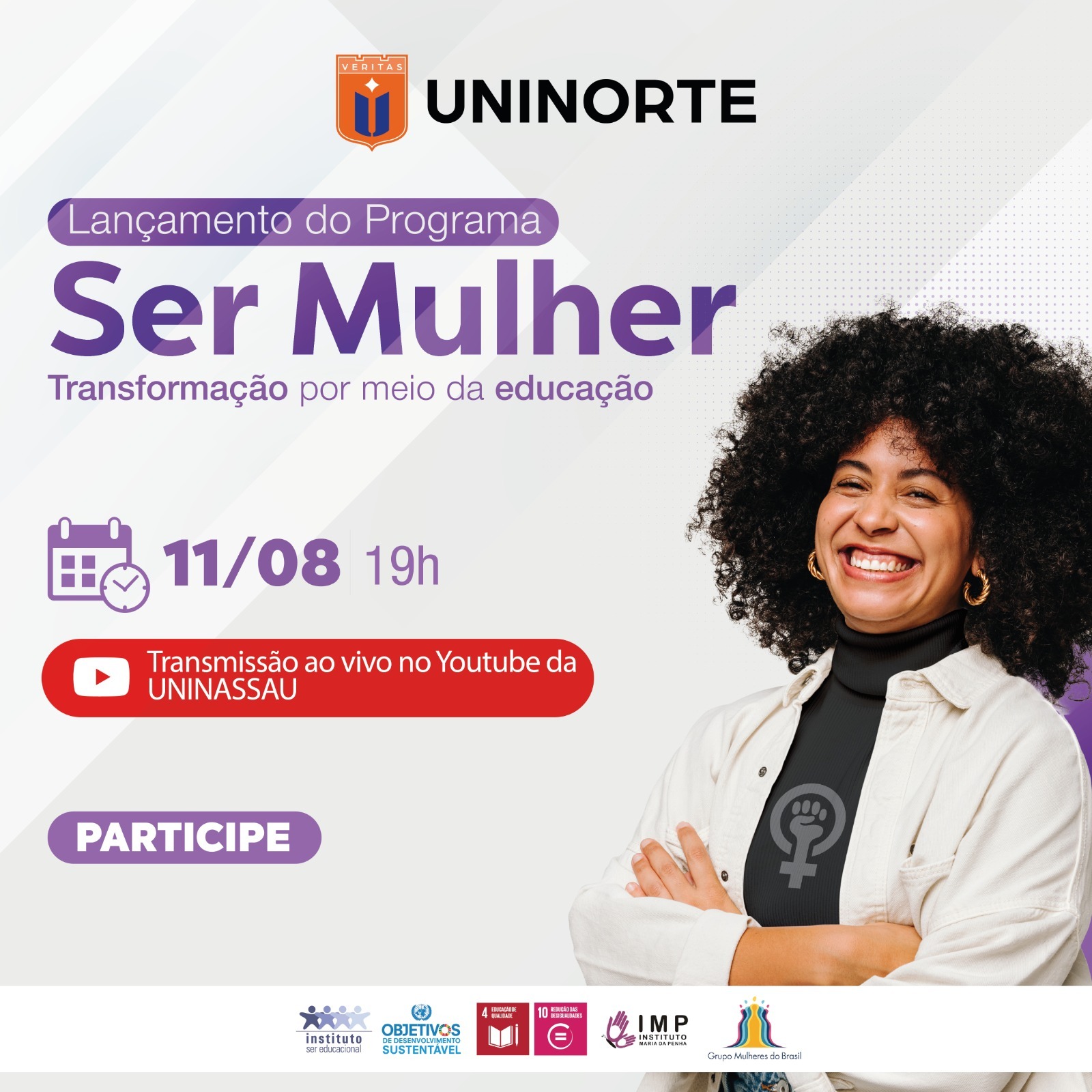O lançamento do programa acontece no dia 11 de agosto, às 19h. A data foi escolhida por estar na semana que se comemora 17 anos da sanção da Lei Maria da Penha e o aniversário de 20 anos do grupo Ser Educacional. O evento será transmitido por meio do canal da UNINASSAU no YouTube e contará com a participação on-line de Maria da Penha, que empresta seu nome para a lei que protege mulheres vítimas de violência.