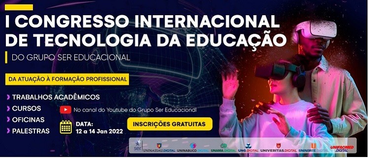 O grupo Ser Educacional mantenedor das marcas UNINASSAU, UNAMA, UNINORTE, UNIFACIMED, UNG, UNIVERITAS, UNINABUCO, UNIJUAZEIRO, UNESC e UNIFASB, realiza o I Congresso Internacional da Tecnologia da Educação, com conteúdos diversos sobre a área. Durante o evento, os inscritos poderão acompanhar apresentações de trabalhos acadêmicos, palestras, oficinas e cursos. O evento acontece do dia 12 a 14 de janeiro, no canal do grupo Ser Educacional no Youtube. As inscrições são gratuitas e abertas ao público.