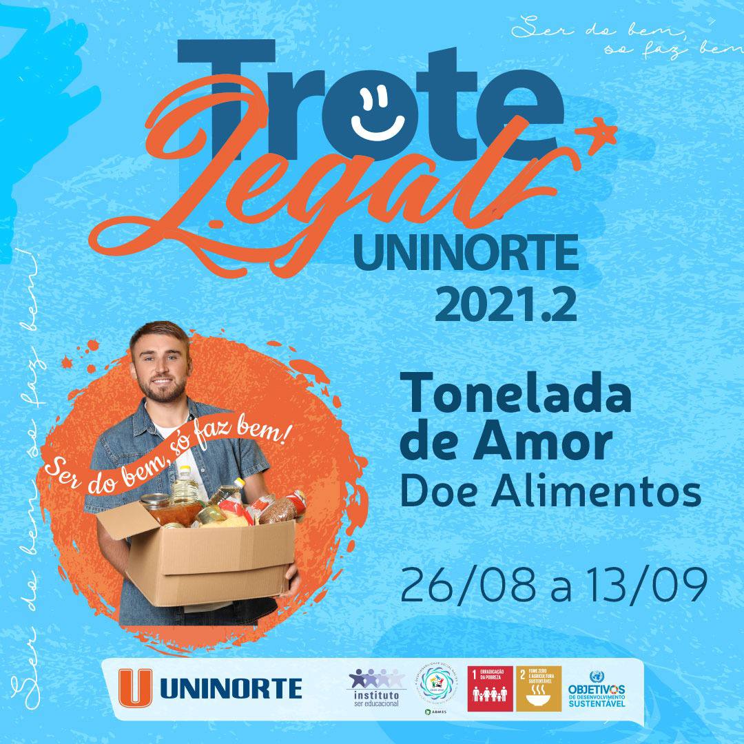 Com o início do semestre letivo, a UNINORTE – Centro Universitário do Norte realiza mais uma edição da campanha solidária de boas-vindas aos alunos, o Trote Legal. Dessa vez, o tema da ação é Tonelada de Amor – Doe Alimentos, e tem por objetivo arrecadar itens alimentícios para a Casa da Criança e para o Instituto Desafio Jovem Manaus.
