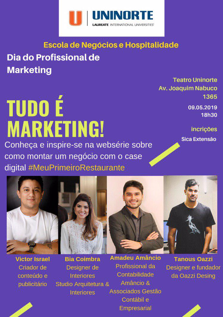 Os convidados são Victor Israel, egresso de Publicidade Propaganda da UniNorte, Bia Coimbra, Designer de Interiores, Amadeu Amâncio, profissional da Contabilidade e Tanous Oazzi, Designer e fundador da Oazzi Design. Eles apresentarão o case Websérie #MeuPrimeiroRestaurante onde cada um falará da sua participação em um Talk no palco do Teatro.