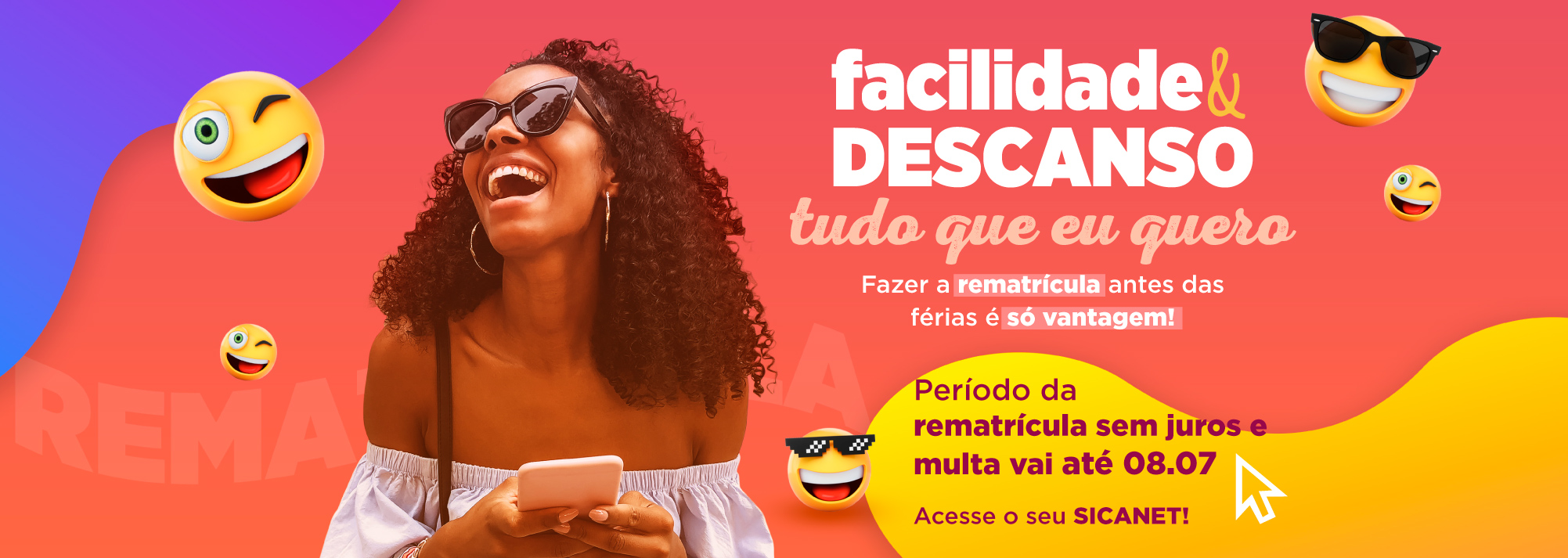 Últimos dias para fazer a rematrícula sem juros, acesse o boleto pelo Sicanet até 08.07. Faça sua renovação sem demora e sem filas.