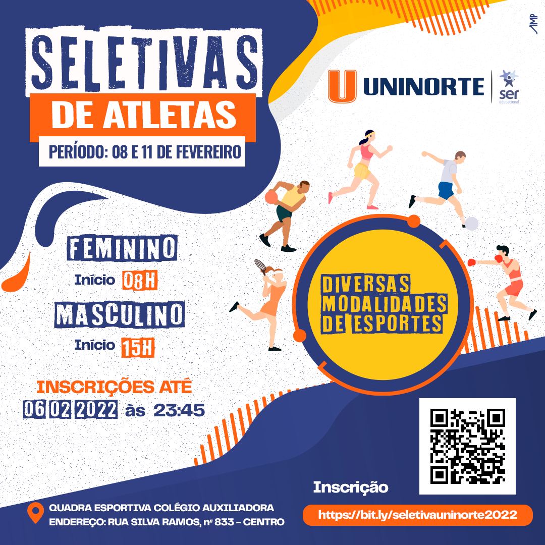 Estão abertas as inscrições para a seletiva de atletas da UniNorte – Centro Universitário do Norte. O objetivo é selecionar atletas de alto rendimento para integrarem as equipes desportivas da Instituição de Ensino em diversas modalidades. Os interessados podem se inscrever, até o dia 6 de fevereiro pelo link https://bit.ly/seletivauninorte2022.