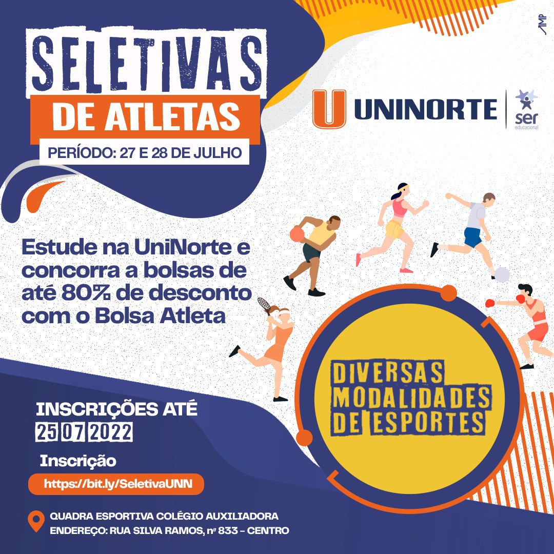 A UniNorte – Centro Universitário do Norte realiza seletiva de atletas em diversas modalidades desportivas nos dias 27 e 28 de julho. Os interessados devem se inscrever, de forma on-line e gratuita, até o dia 25 de julho no link https://bit.ly/SeletivaUNN. A seleção é exclusiva para novos alunos e sem limite de idade.