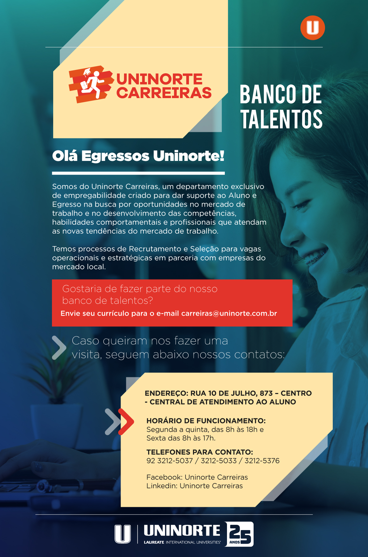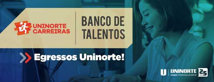 Você que se formou na UniNorte agora tem a oportunidade de cadastrar seu currículo no nosso Banco de Talentos pelo e-mail: carreiras@uninorte.com.br.