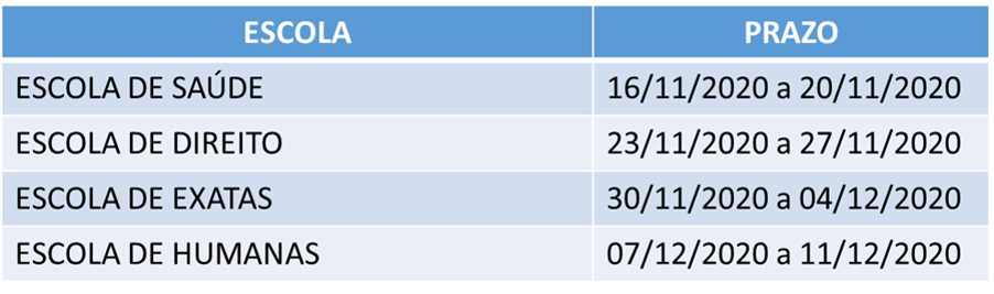 Os estudantes que possuem bolsas do Programa Universidade Para Todos (PROUNI), devem ficar atentos ao calendário para assinatura do usufruto da bolsa referente a 2020.2. O aluno deverá comparecer a Central de Relacionamento ao Aluno (CRA), localizada na unidade 10, das 8h às 19h, conforme calendário abaixo, portando documento com foto para a realização da assinatura.
