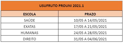 Os estudantes que possuem bolsas do Programa Universidade Para Todos (PROUNI), devem ficar atentos ao calendário para assinatura do usufruto da bolsa referente a 2021.1. O aluno deverá comparecer a Central de Relacionamento ao Aluno (CRA), localizada na unidade 10, das 8h às 17h, conforme calendário abaixo, portando documento com foto para a realização da assinatura.