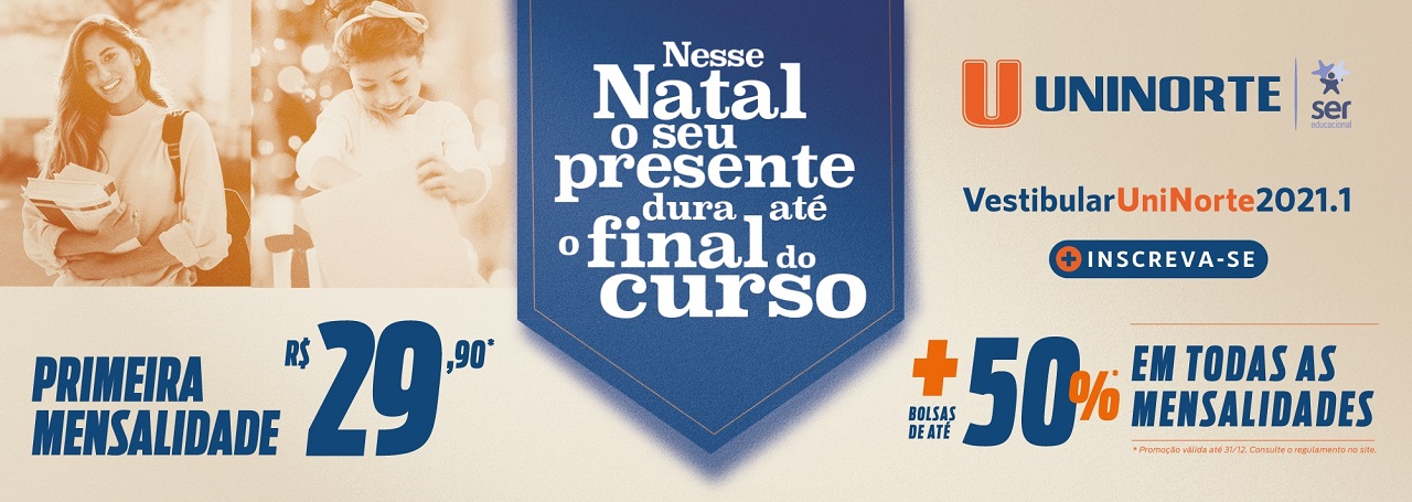 A UniNorte – Centro Universitário do Norte está com uma campanha especial de Natal para quem deseja iniciar 2021 cursando uma graduação. Serão ofertadas bolsas de estudos de até 50% de desconto, válido até o final do curso, e a primeira mensalidade a R$29,90. Para aproveitar a oportunidade, os interessados devem acessar o endereço vestibular.uninorte.com.br.