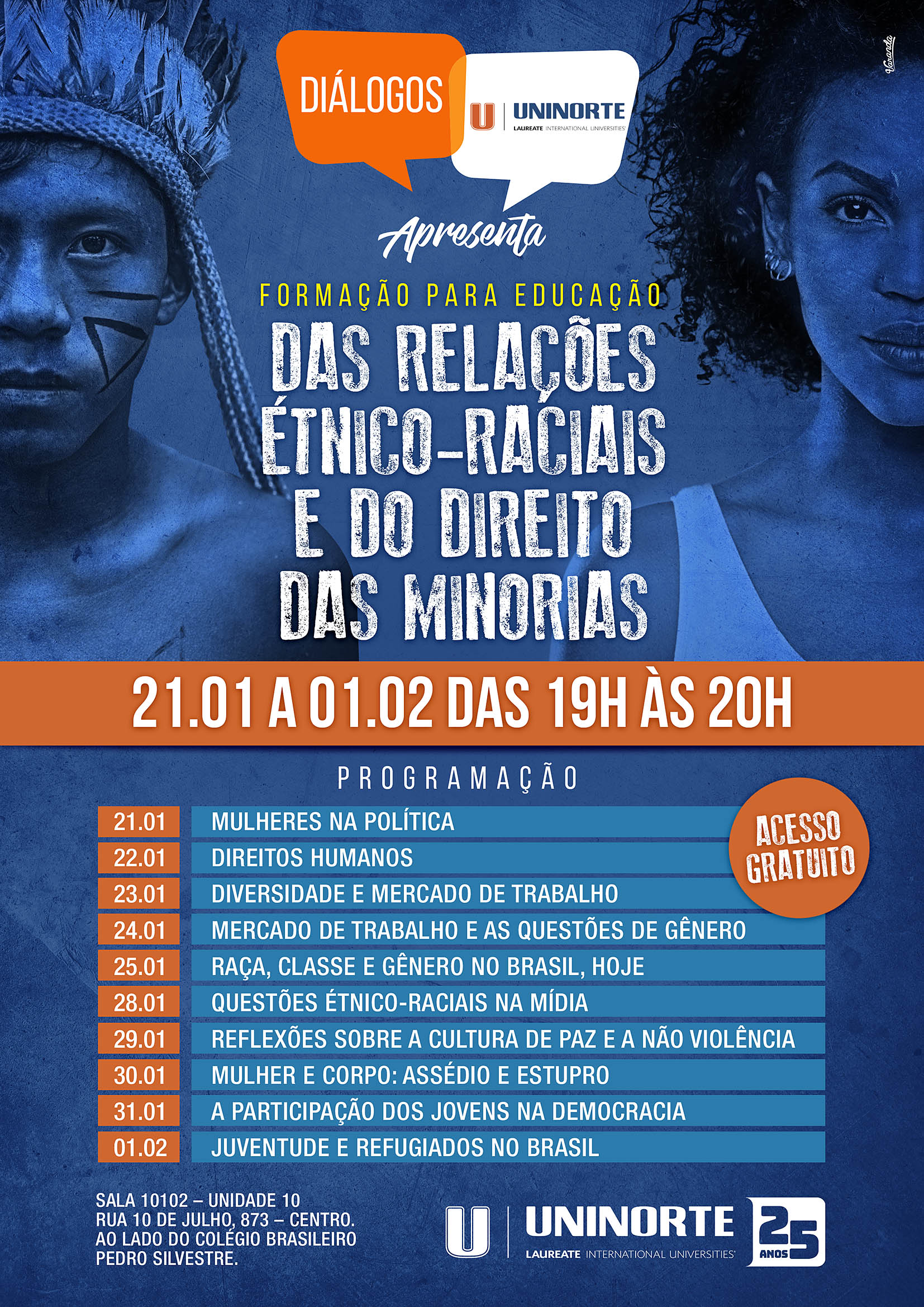 Com o objetivo de discutir, junto a comunidade acadêmica questões importantes e sensíveis da atualidade e sociedade, a UniNorte promove, entre os dias 21.01 e 01.02, roda de conversa com o tema “Formação para Educação das relações Étnico Raciais e Direito das Minorias”