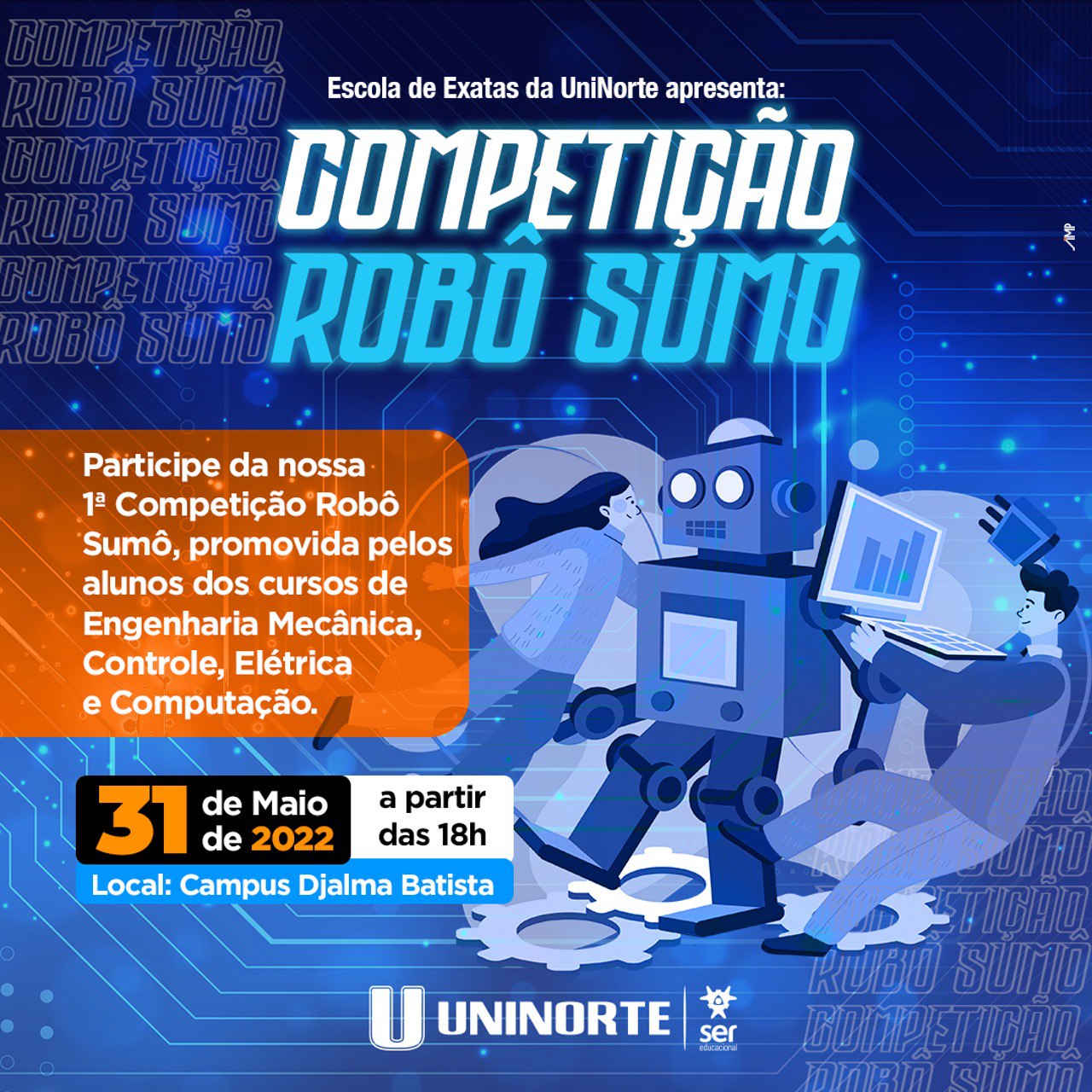 Nesta terça-feira, dia 31, a UniNorte realiza a competição Robô Sumô, uma disputa de engenharia e robótica onde as equipes se enfrentam por meio de robôs em uma arena. Os robôs foram construídos pelos alunos dos cursos das Engenharia Mecânica, de Controle, Elétrica e Computação. O evento ocorre na Unidade 22 da UniNorte, situada na avenida Djalma Batista, a partir das 18h.