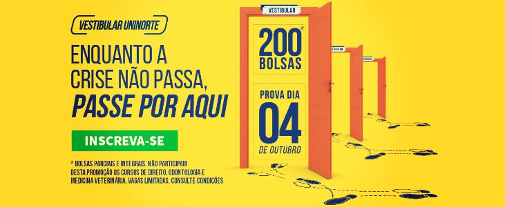 Quinta-feira, 17 de Setembro de 2015 às 12h51A UniNorte realiza no dia 04 de outubro um novo Vestibular para os interessados em ingressar na instituição no primeiro semestre de 2016. Nesta edição, a instituição oferece mais de 200 bolsas de estudos com descontos de até 100%*. Essa crise, não tem previsão de passar, mas o que temos para você, é intransferível! Enquanto a crise não passa, gere oportunidades para você!